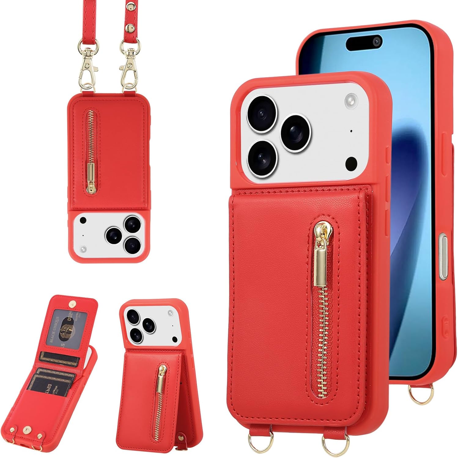 for iPhone 17 Pro Wallet Case with Card Holder Slots and Strap, RFID Blocking Magnetic Flip Folio Cover, Crossbody Purse Protection Case with Kickstand,Red Diamond